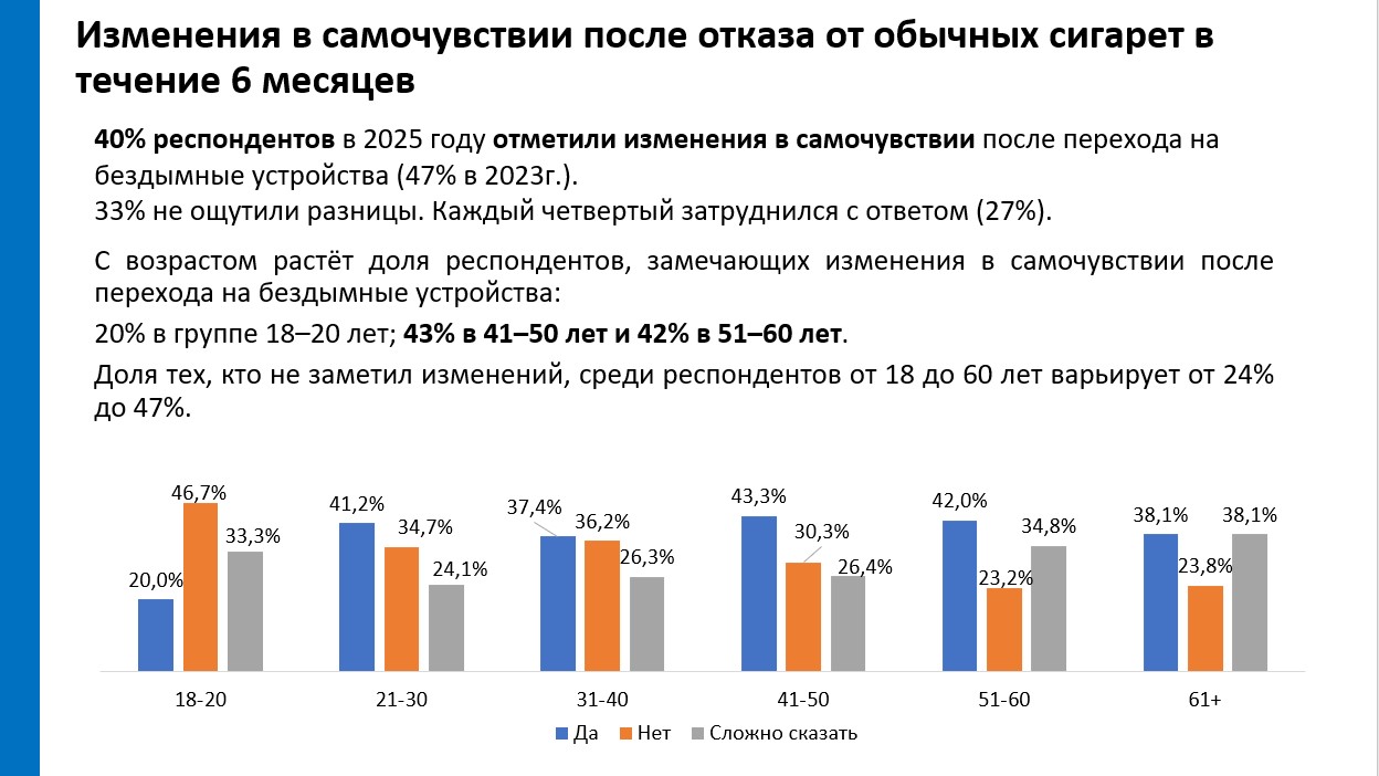 Среди потребителей, перешедших от сигарет к обычным продуктам, 40% респондентов в 2025 году отметили положительные изменения в самочувствии, 33% не ощутили разницы, 27% затруднились с ответом.