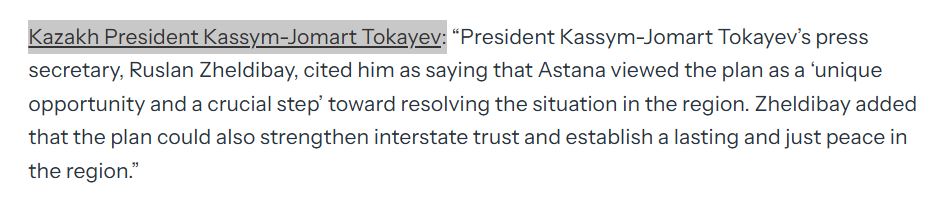 В тексте статьи Белого дома приводятся слова пресс-секретаря Касым-Жомарта Токаева Руслана Желдибая. Ранее он процитировал слова президента о том, что Астана видит план Трампа «уникальной возможностью и важным шагом» к урегулированнию ситуации.