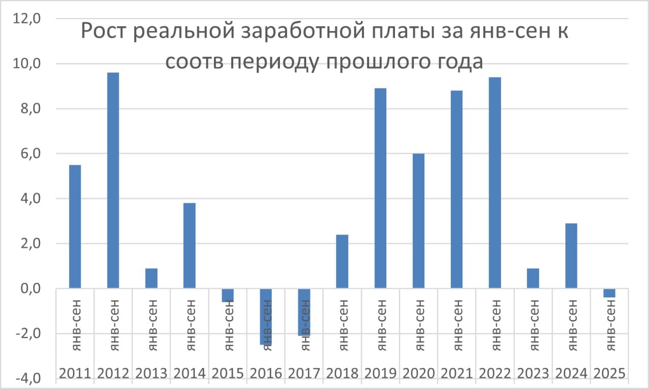 - Вышли данные по заработной плате за 3-й квартал 2025. В нем уже точно падение на 2% год к году, то есть квартальная динамика устойчиво и быстро ухудшается.