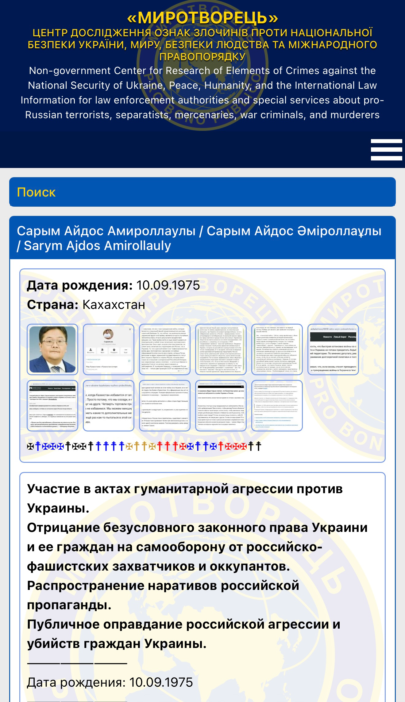 Авторы базы считают, что эти инициативы направлены на подавление общественной поддержки Украины, репрессии против лиц, признающих её право на самооборону, а также на защиту инфраструктуры, связанной в том числе с экспортом российской нефти. К слову, Сарым стал первым казахстанским депутатом, попавшим в базу «Миротворец».