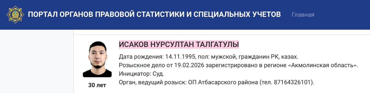 Согласно базе, розыскное дело зарегистрировано 19 февраля 2026 года в Акмолинской области. Инициатор — суд. Розыск ведёт отдел полиции Атбасарского района. В ориентировке указано: Нурсултан Талгатулы Исаков, дата рождения — 14 ноября 1995 года, гражданин Республики Казахстан, казах, мужчина.