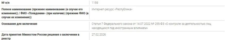 В обосновании ведомство заявило, что «Республика» распространяла материалы иностранных агентов и организаций, признанных в России нежелательными, а также публиковала «недостоверную информацию» о решениях российских властей.