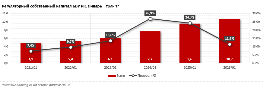 По данным Ranking.kz, на 1 февраля текущего года регуляторный собственный капитал казахстанских банков достиг 10,7 трлн тг — на 11,6% больше, чем в аналогичном периоде 2025-го. В целом последние годы наблюдается стабильный рост показателя. Так, последние пять лет собственный капитал БВУ РК ежегодно увеличивается в среднем на 17,2%, что свидетельствует о достаточно высоких темпах укрепления капитальной базы банковского сектора.