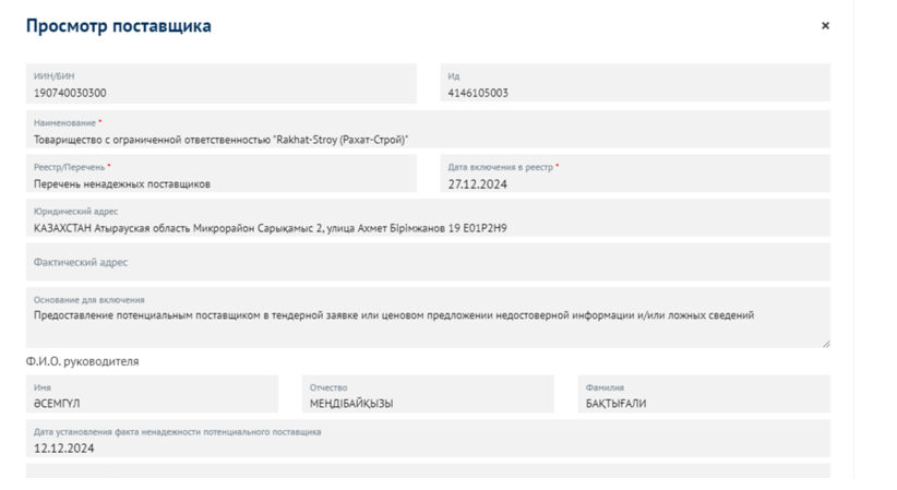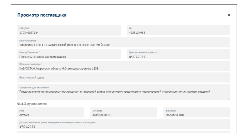 Но самая парадоксальная глава этой истории развернулась в начале 2025 года. Согласно данным, доступным на портале zakup.sk.kz, 17 января 2025 года другая дочерняя компания АО «КазМунайГаз» установила, что ТОО «Мейрәлі» предоставило недостоверные сведения в своей тендерной заявке по аналогичным услугам. На основании этого 5 марта 2025 года фирма была официально внесена в реестр недобросовестных участников закупок.