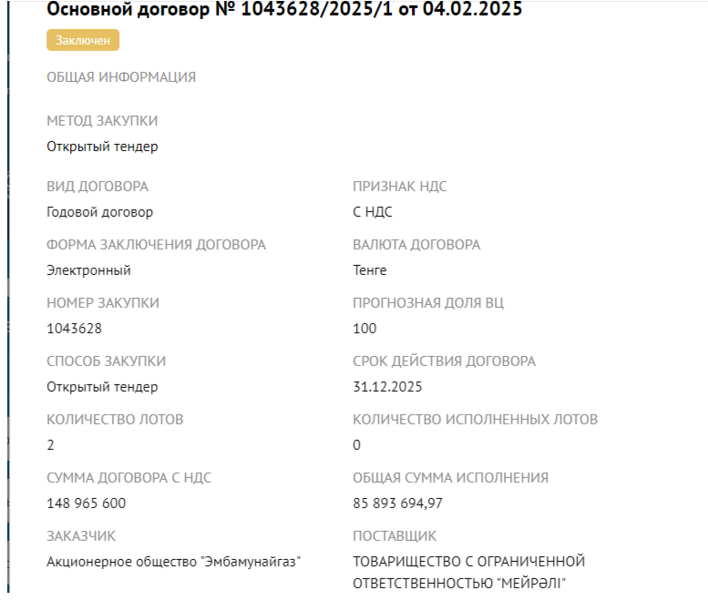 Однако «Эмбамунайгаз» и тут продемонстрировал уникальный подход к корпоративной дисциплине. Действующие контракты с «Мейрәлі» не были расторгнуты. Более того, как показывают данные с того же портала zakup.sk.kz, уже будучи в «черном списке», ТОО «Мейрәлі» не только продолжило работу, но и выиграло новые тендеры от «Эмбамунайгаза» – на организацию питания работников (контракты №1041414/2025/1-1 и №1043628/2025/1).
