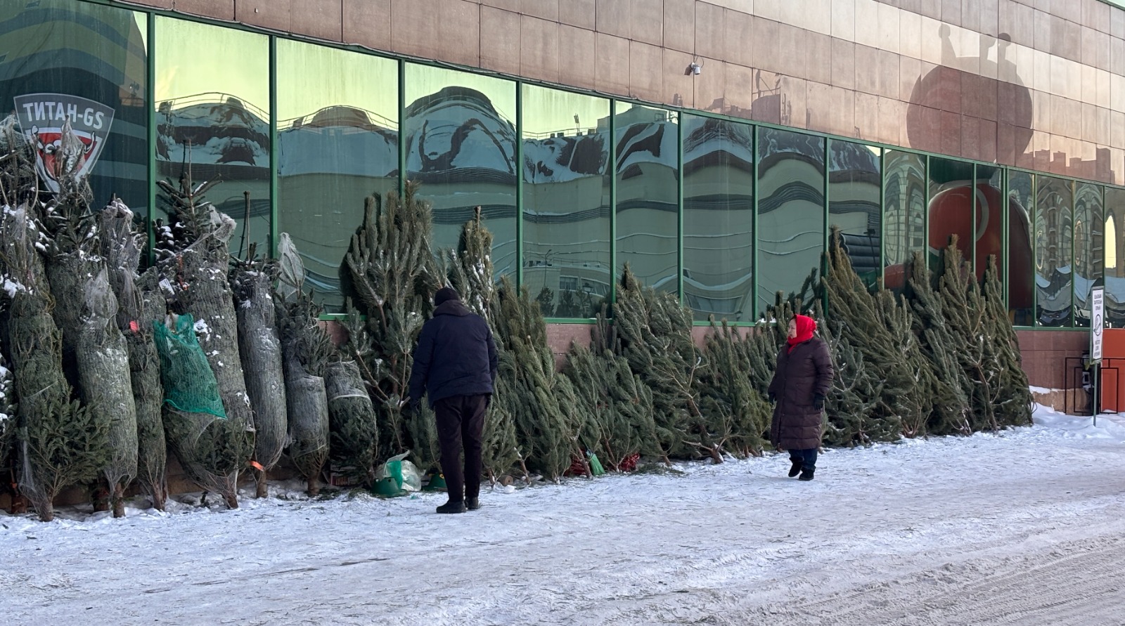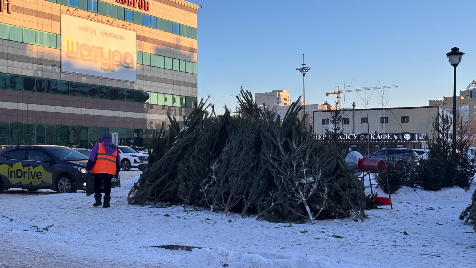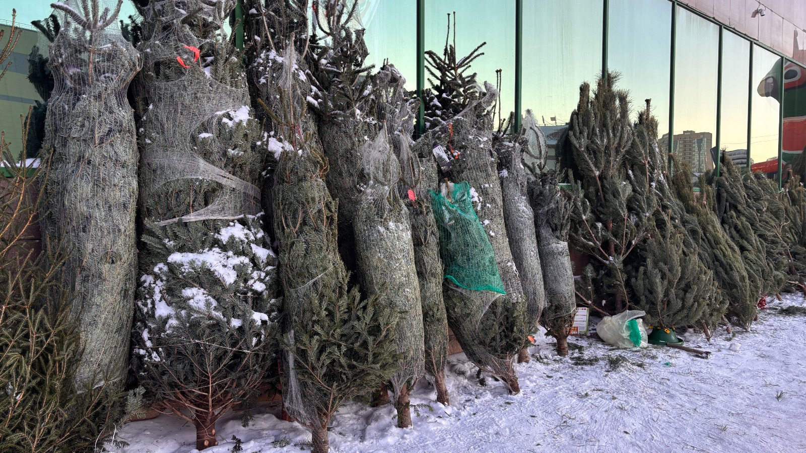 Продавец этих ёлок рассказал, что это европейские пихты, предположительно из Дании, и самые дешёвые оцениваются в 80 тысяч тенге. Самые большие экземпляры доходят до 150 тысяч. Он предложил обратить внимание на иголки заморских ёлок: они как будто сделаны из пластика.