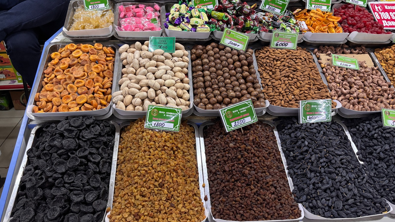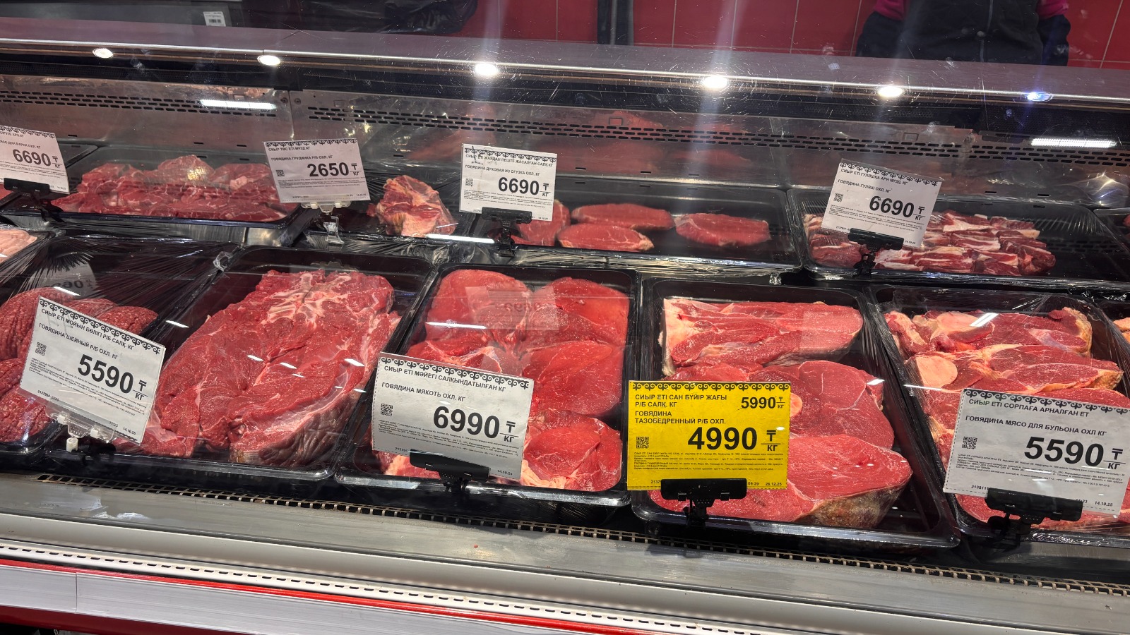 Для сравнения цен корреспондент Ulysmedia.kz посетила ближайший гипермаркет. Там майонез стоил 1279 тенге, помидоры и мандарины — 799 тенге, картошка — 195 тенге, бананы — 1065 тенге. Мясо, которого не было на рынке, доходило до 7 тысяч тенге. Но где-то там, вдалеке, лежал одинокий кусок говяжьей грудинки по 2650 тенге — как раз по той цене, что обещало казахстанцам правительство.