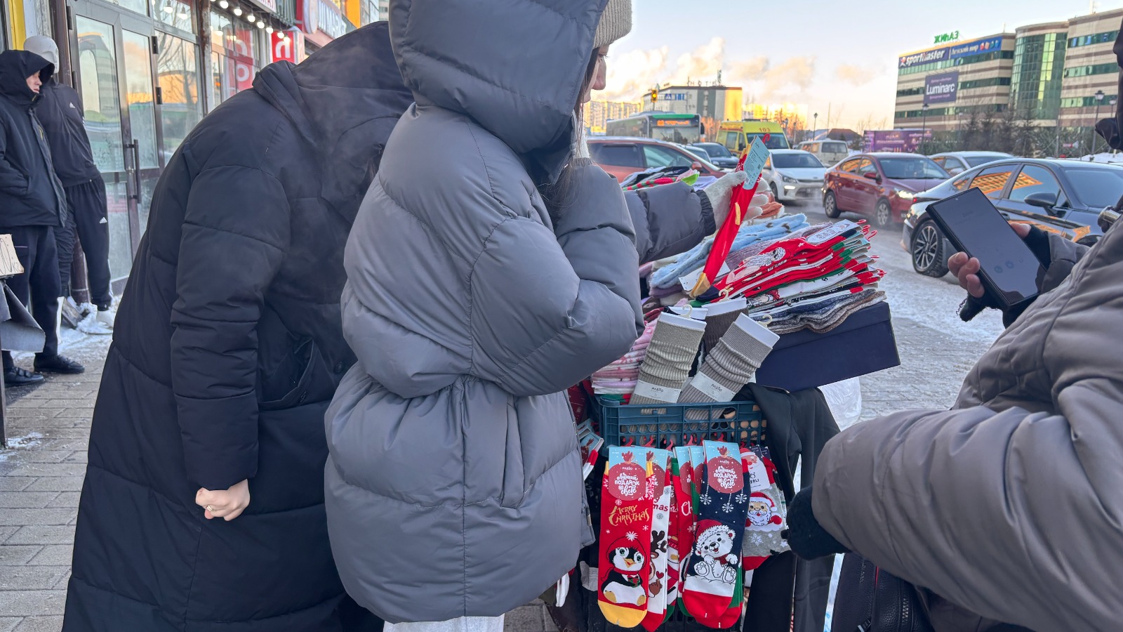 После покупки продуктов к новогоднему столу, сделав причёску и маникюр, можно по дороге купить дешёвые и симпатичные носки за 250 тенге.
