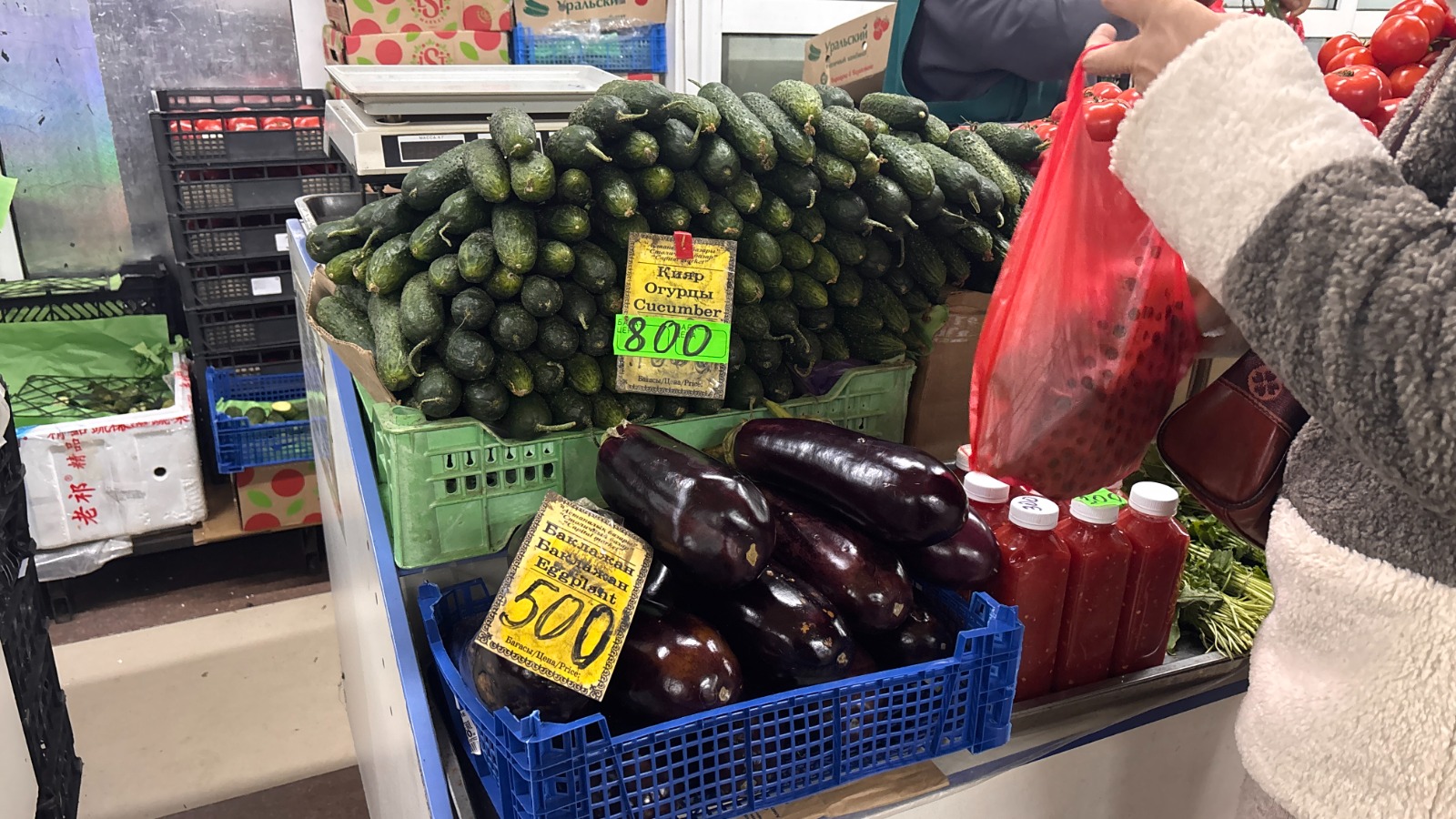 Помидоры и огурцы — от 600 до 800 тенге, хотя качество приходится оценивать на глаз.