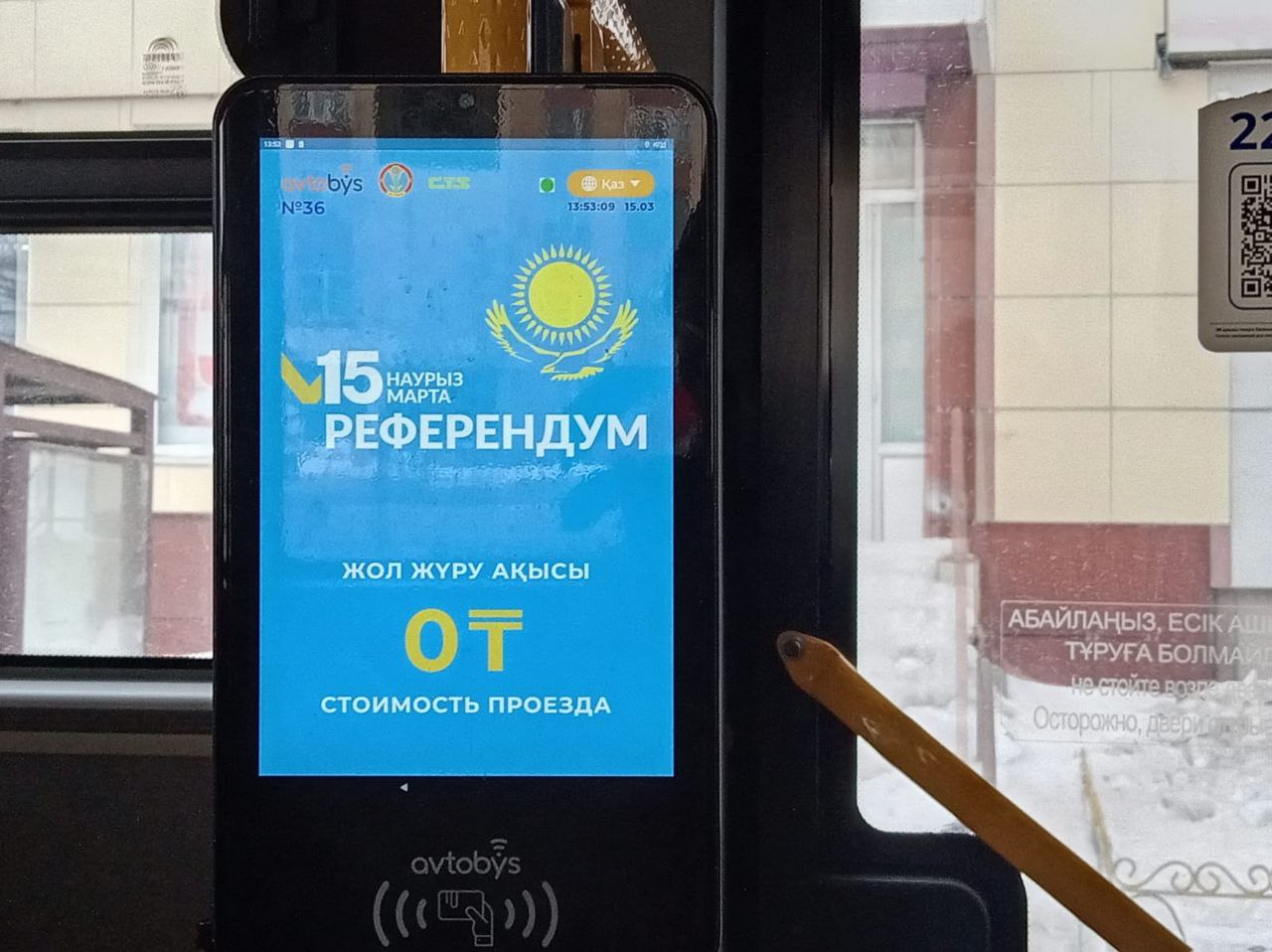 В честь референдума проезд в столичных автобусах сделали бесплатным, а, чтобы астанчане не отдали свои деньги автопаркам по привычке, соответствующее объявление разметили на самих табло валидации.