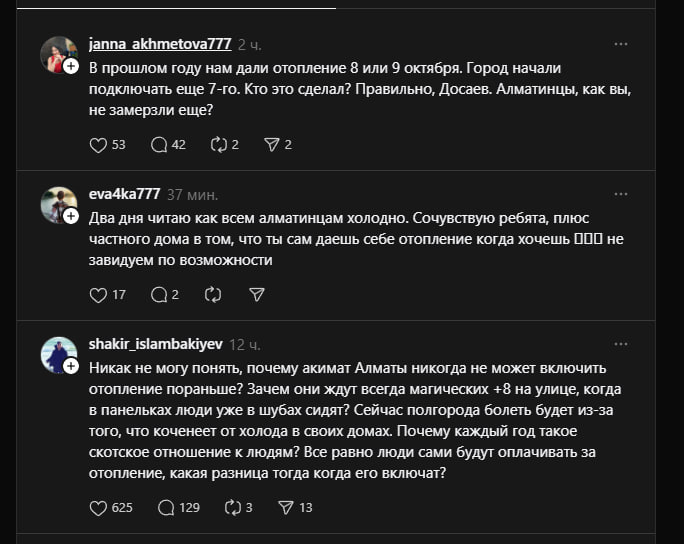 Ранее жители Алматы жаловались в соцсетях о том, что власти города не подают тепло в холодные дома. Некоторые заявляли, что «на улице теплее, чем в квартирах».