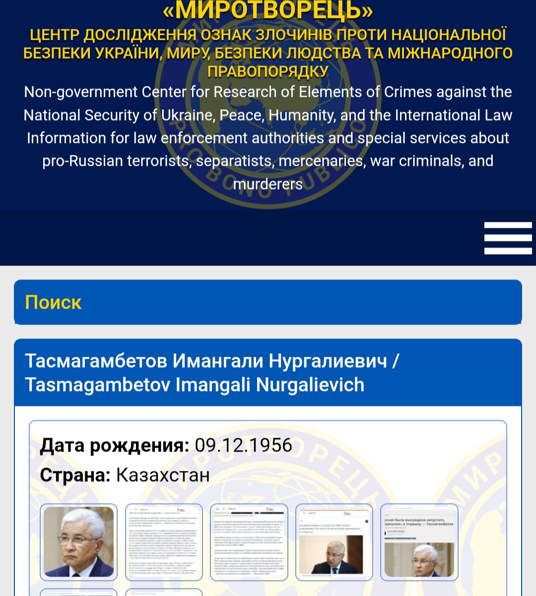 На сайте "Миротворца" утверждают, что Тасмагамбетов якобы является сторонником войны, а также поддерживает ракетные удары по Украине.