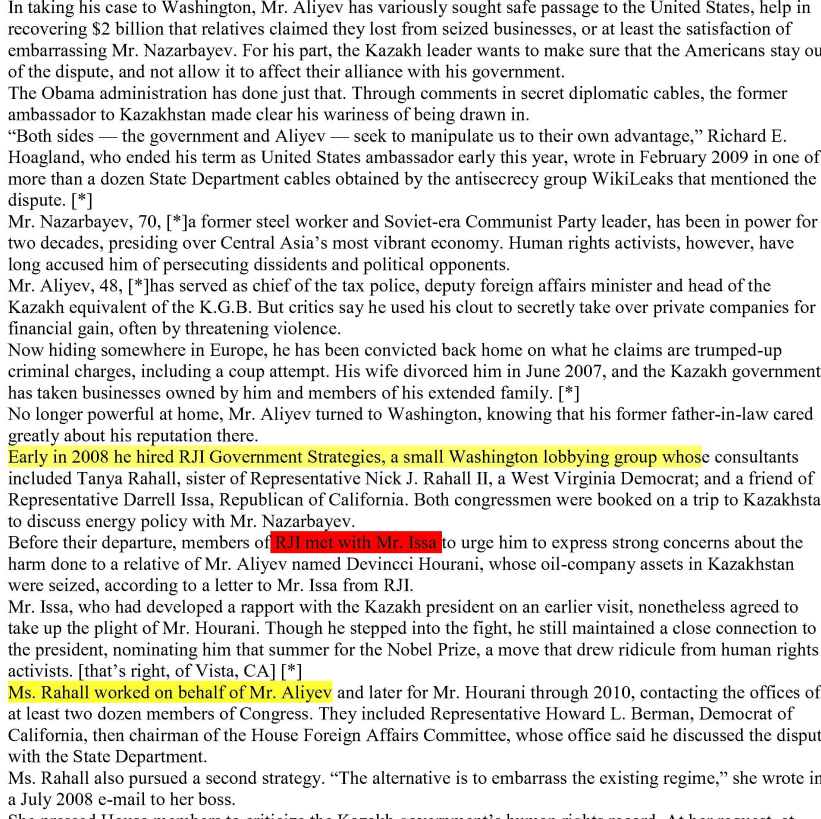 Помимо прочего, Алиев, согласно информации из писем, нанял компанию, которая продвигала визиты американских законодателей в Казахстан и представляла Алиева в качестве жертвы политических репрессий.