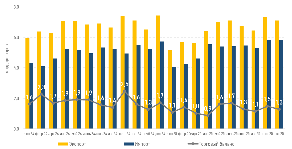 — Из опубликованной статистики отметим, что экспорт страны за десять месяцев сократился до 64,6 млрд долларов (-4,6% год к году), тогда как импорт вырос до 51,7 млрд долларов (+4,7% год к году). Таким образом, профицит торгового баланса значительно снизился и составил 12,9 млрд долларов против 18,3 млрд долларов за аналогичный период 2024 года, — указывают в АФК.