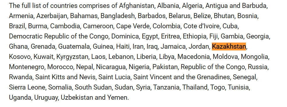 В перечень стран вошли Казахстан, Сомали, Россия, Афганистан, Бразилия, Иран, Ирак, Египет, Нигерия, Таиланд, Йемен и другие.