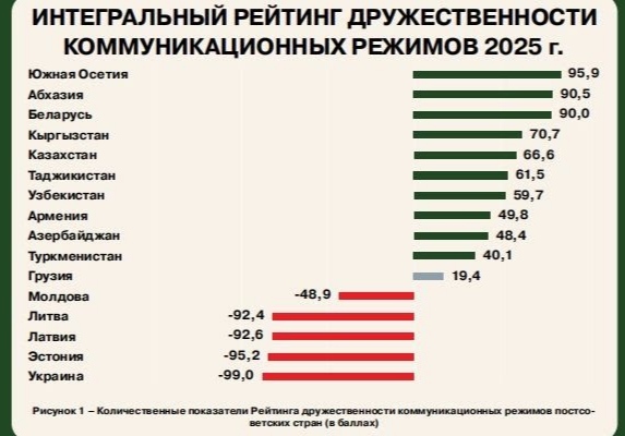 Национальный исследовательский институт развития коммуникаций (НИИРК, Москва) представил рейтинг стран по отношению к России в 2025 году. Список дружественных государств возглавили Южная Осетия, Абхазия и Беларусь. Далее с существенным отставанием следуют Кыргызстан, Казахстан, Таджикистан и Узбекистан.