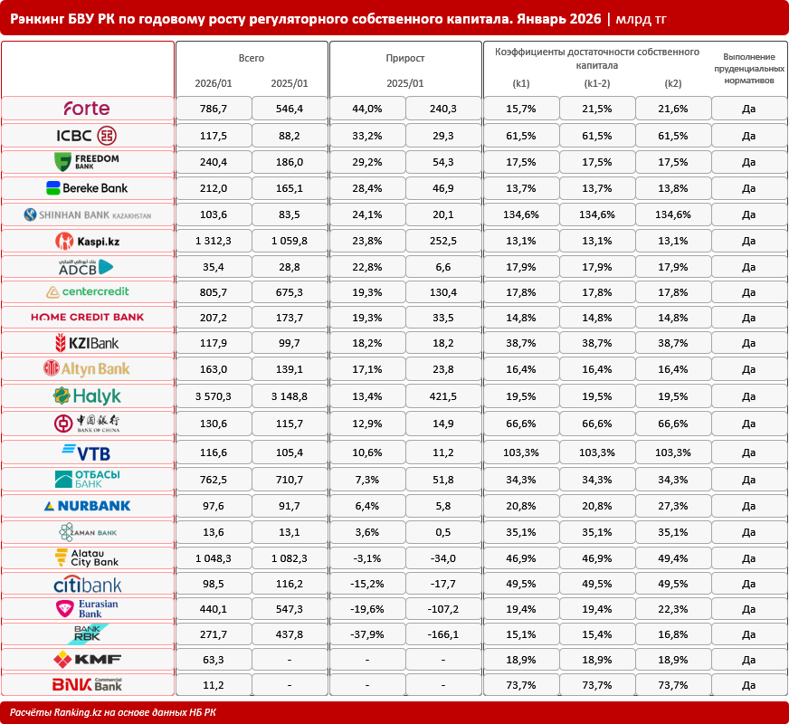 В годовой динамике рост показателя был зафиксирован у 17 из 23 БВУ РК. Сокращение регуляторного собственного капитала наблюдалось у четырёх банков, а ещё два фининститута — KMF Банк и Коммерческий Банк БиЭнКей — являются новыми участниками рынка, поэтому годовая динамика по ним пока не сформировалась.