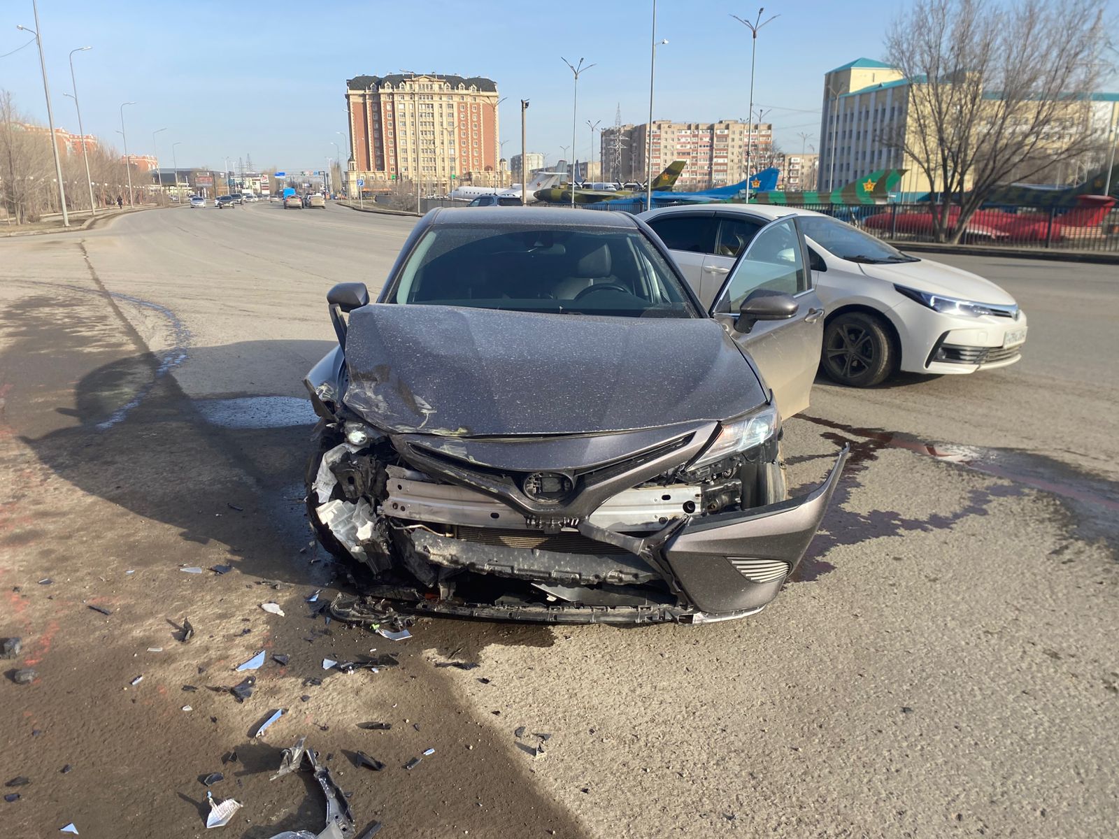 Авария произошла на проспекте Санкибай батыра, рядом с гипермаркетом «Дина». По данным полиции, столкнулись автомобиль скорой помощи и Toyota. От удара карета скорой перевернулась на бок.