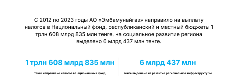 С 2012 по 2023 годы компания направила в бюджеты всех уровней и Нацфонд более 1,6 трлн тенге. Предполагается, что каждый тенге из этой суммы был потрачен с максимальной эффективностью и только на благо государства.