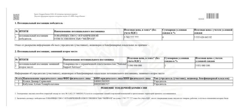 Но самая парадоксальная глава этой истории развернулась в начале 2025 года. Согласно данным, доступным на портале zakup.sk.kz, 17 января 2025 года другая дочерняя компания АО «КазМунайГаз» установила, что ТОО «Мейрәлі» предоставило недостоверные сведения в своей тендерной заявке по аналогичным услугам. На основании этого 5 марта 2025 года фирма была официально внесена в реестр недобросовестных участников закупок.