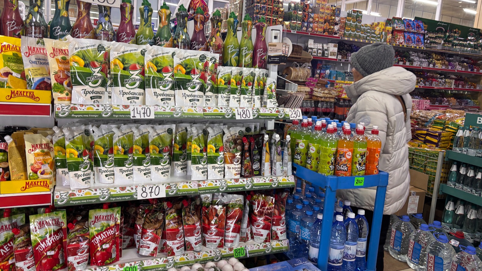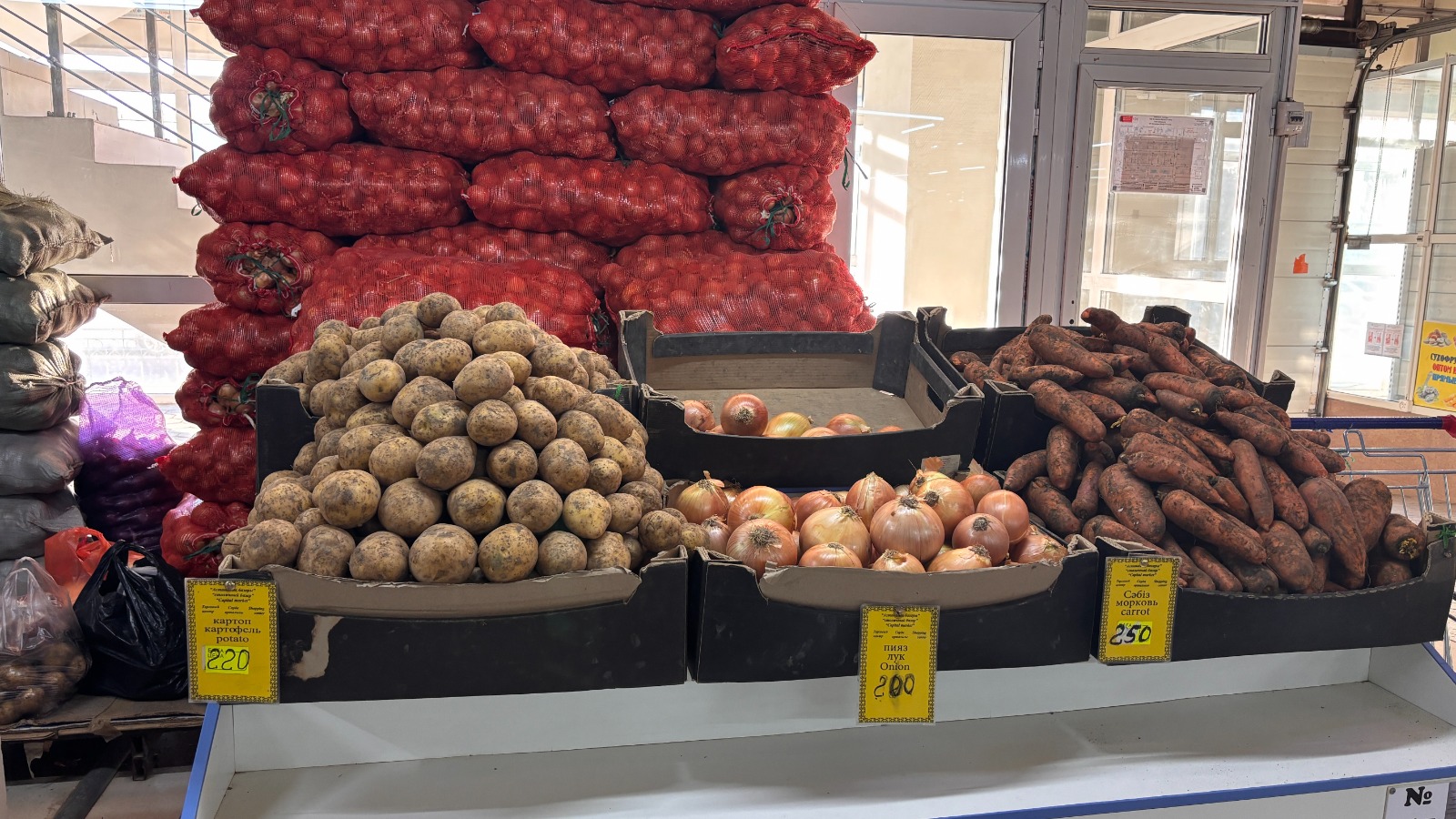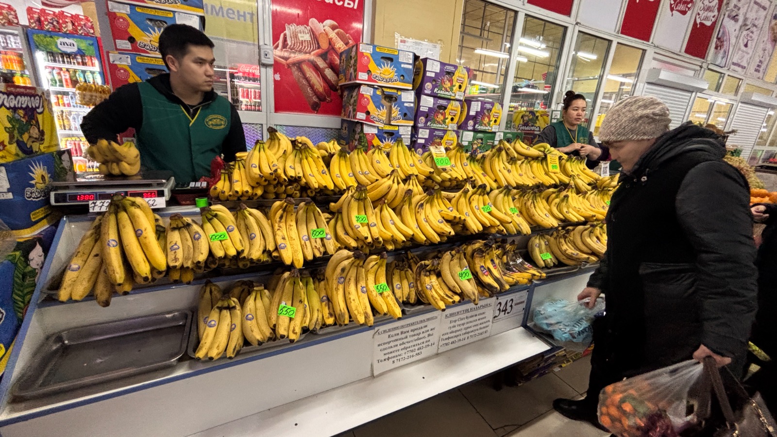 Для сравнения цен корреспондент Ulysmedia.kz посетила ближайший гипермаркет. Там майонез стоил 1279 тенге, помидоры и мандарины — 799 тенге, картошка — 195 тенге, бананы — 1065 тенге. Мясо, которого не было на рынке, доходило до 7 тысяч тенге. Но где-то там, вдалеке, лежал одинокий кусок говяжьей грудинки по 2650 тенге — как раз по той цене, что обещало казахстанцам правительство.