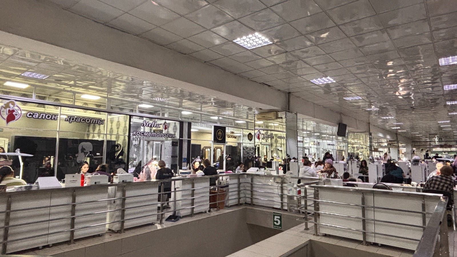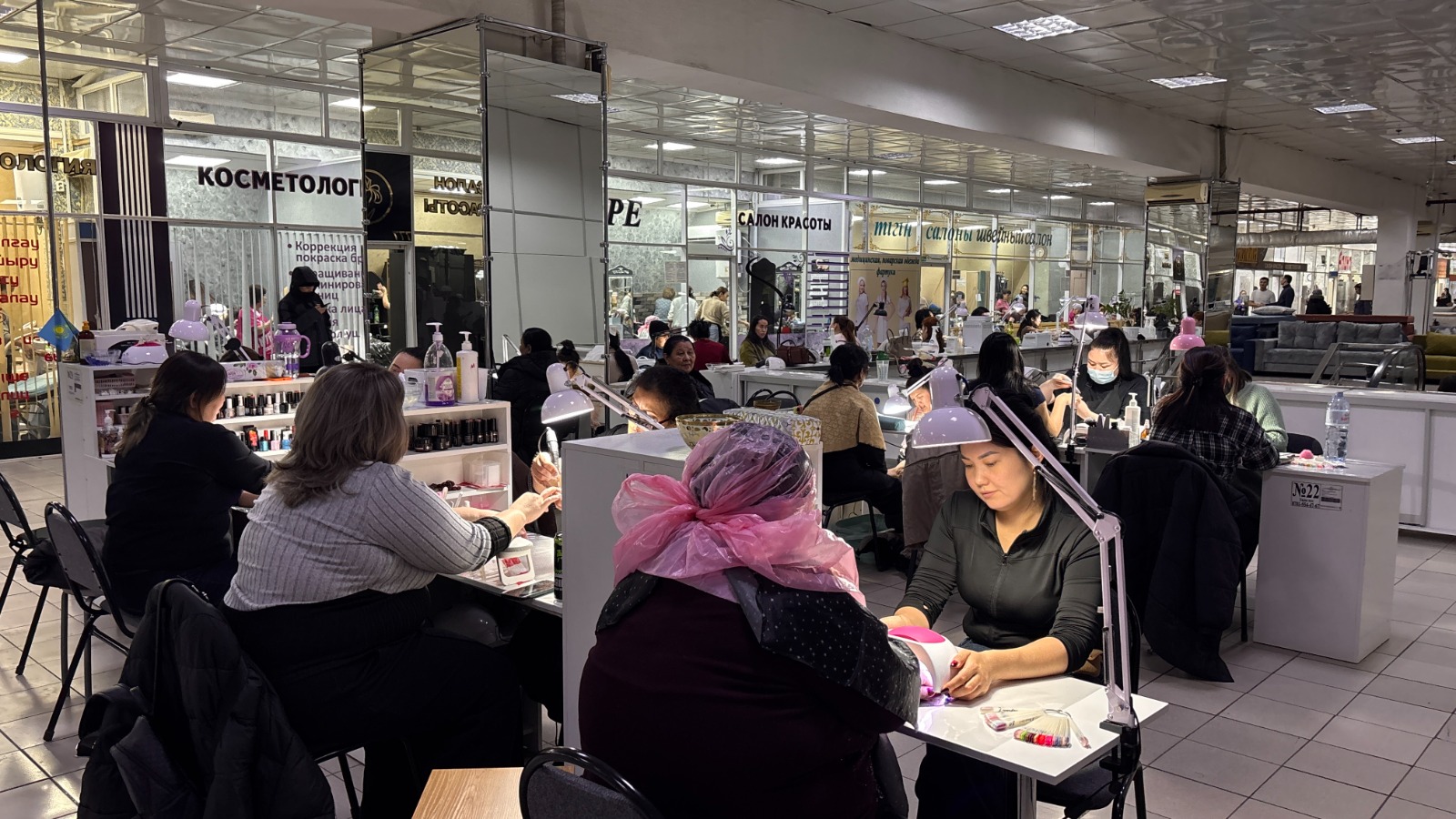 Неожиданно на шестом этаже рынка обнаружился целый сектор парикмахеров и мастеров маникюра. Эта услуга для ногтей и без предварительной записи с гель-лаком стоит 7000 тенге, а обычный — 4000. Количество клиентов удивило: видимо, здесь спрос на высоком уровне.