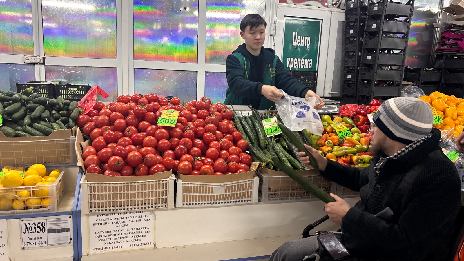 Помидоры и огурцы — от 600 до 800 тенге, хотя качество приходится оценивать на глаз.